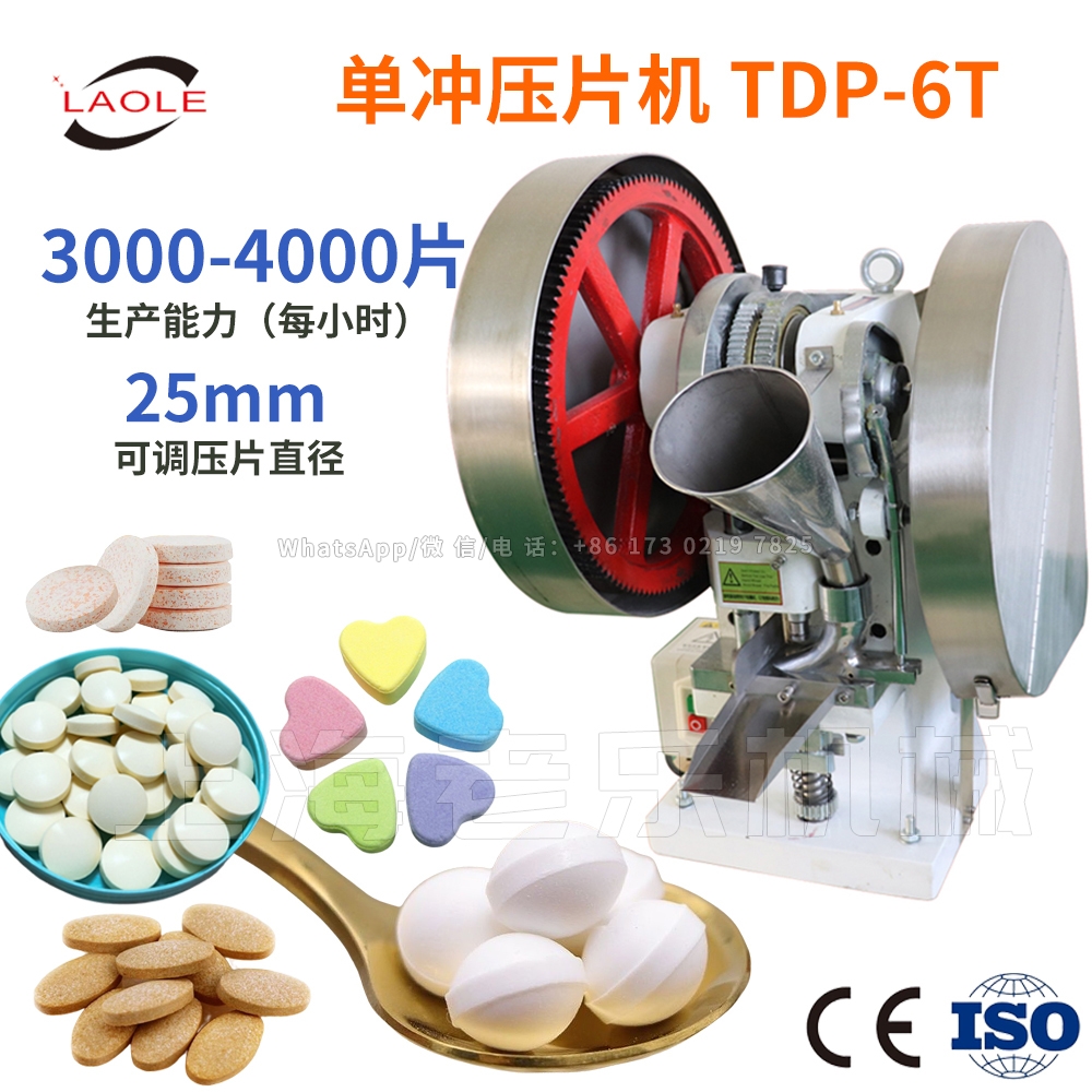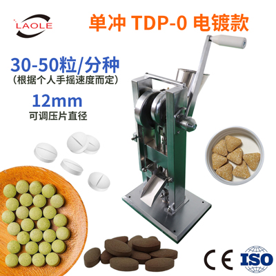 TDP-6單沖壓片機(jī),能將粉粒狀原料壓制成片劑,可適用于制藥廠、化工廠、醫(yī)院、科研單位、實(shí)驗(yàn)室試制和小批量生產(chǎn)。 本機(jī)壓力大,穩(wěn)定,適應(yīng)性強(qiáng),使用方便,易于維修。本機(jī)只裝一付沖模,物料的充填深度、壓片厚度均可調(diào)節(jié)。