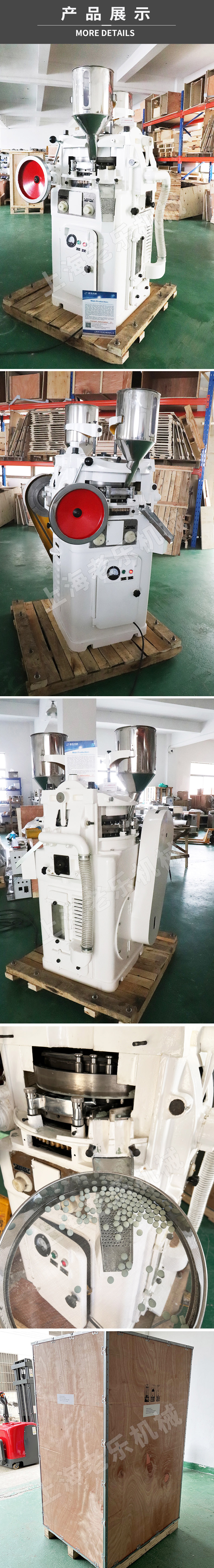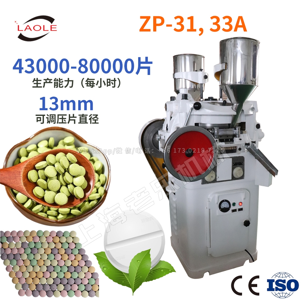 本機(jī)用以將各種顆粒狀原料壓制成圓形片狀,是適合批量生產(chǎn)的設(shè)備,其結(jié)構(gòu)為雙壓式,有兩套加料裝置和兩套壓輪。轉(zhuǎn)盤上可裝33付沖模,旋轉(zhuǎn)一周即可壓制66片,壓片時(shí)轉(zhuǎn)盤的速度、物料的充填深度、壓片厚度均可調(diào)節(jié)。機(jī)上的機(jī)械緩沖裝置可避免過載而引起的機(jī)件損壞。機(jī)內(nèi)配有吸粉箱,通過吸咀可吸取機(jī)器運(yùn)轉(zhuǎn)時(shí)產(chǎn)生的粉塵,避免粘結(jié)堵塞,并可回收原料重新使用??梢愿闹茩C(jī)器,做雙色片,做環(huán)形片。